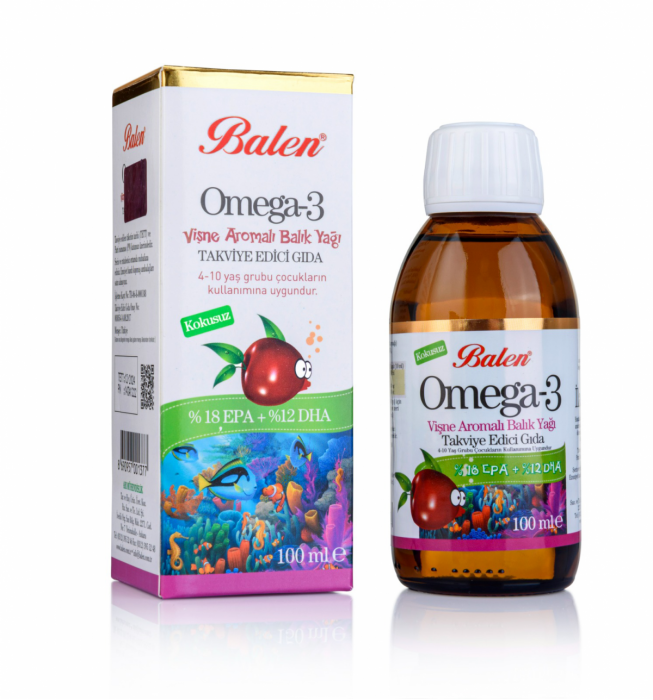 Konya Aktaristan Bitkisel Ürünler mağazamızda sizlere sunduğumuz BALEN Omega-3 Vişne Aromalı, omega-3 yağ asitleri içeren ve vişne aromasıyla tatlandırılmış, sıvı formda hazırlanmış bir takviye edici gıda ürünüdür. Sıvı yapısı sayesinde ölçümü kolaydır; vişne aroması ile kullanım sırasında daha keyifli bir deneyim sunar. Günlük beslenme rutinine pratik şekilde eklenebilecek şekilde formüle edilmiştir.